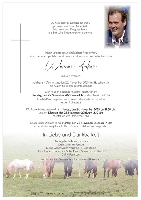 Mit großer Bestürzung geben wir den Tod unseres langjährigen Mitglieds Werner Anker bekannt. Unsere Gedanken sind bei seinen Kindern und weiteren Angehörigen.
